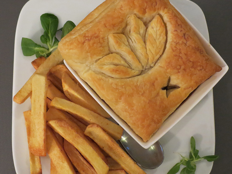 Steak pie- braised beef in a rich red wine gravy covered with a crusty pastry topping