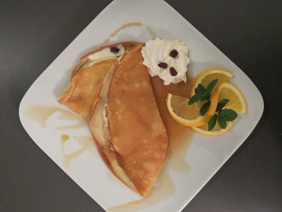 Pancake with raisins & vanilla  cheese filling, served maple syrup
