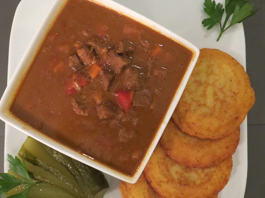 Polish Goulash with traditional potato pancakes in a rich gravy sauce with paprika